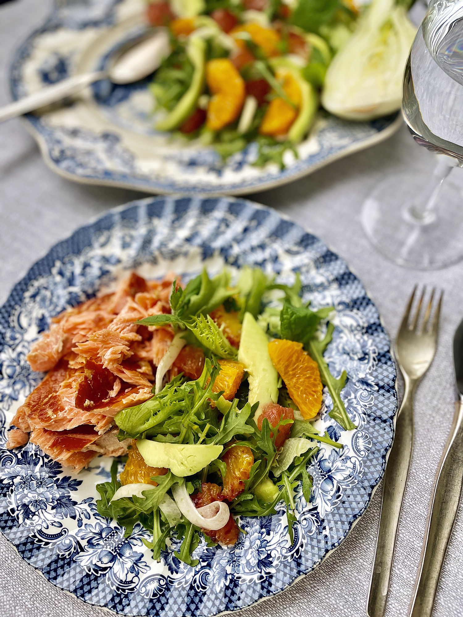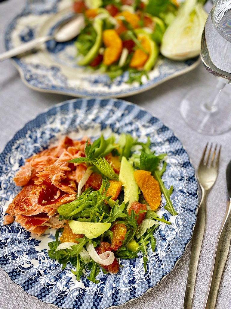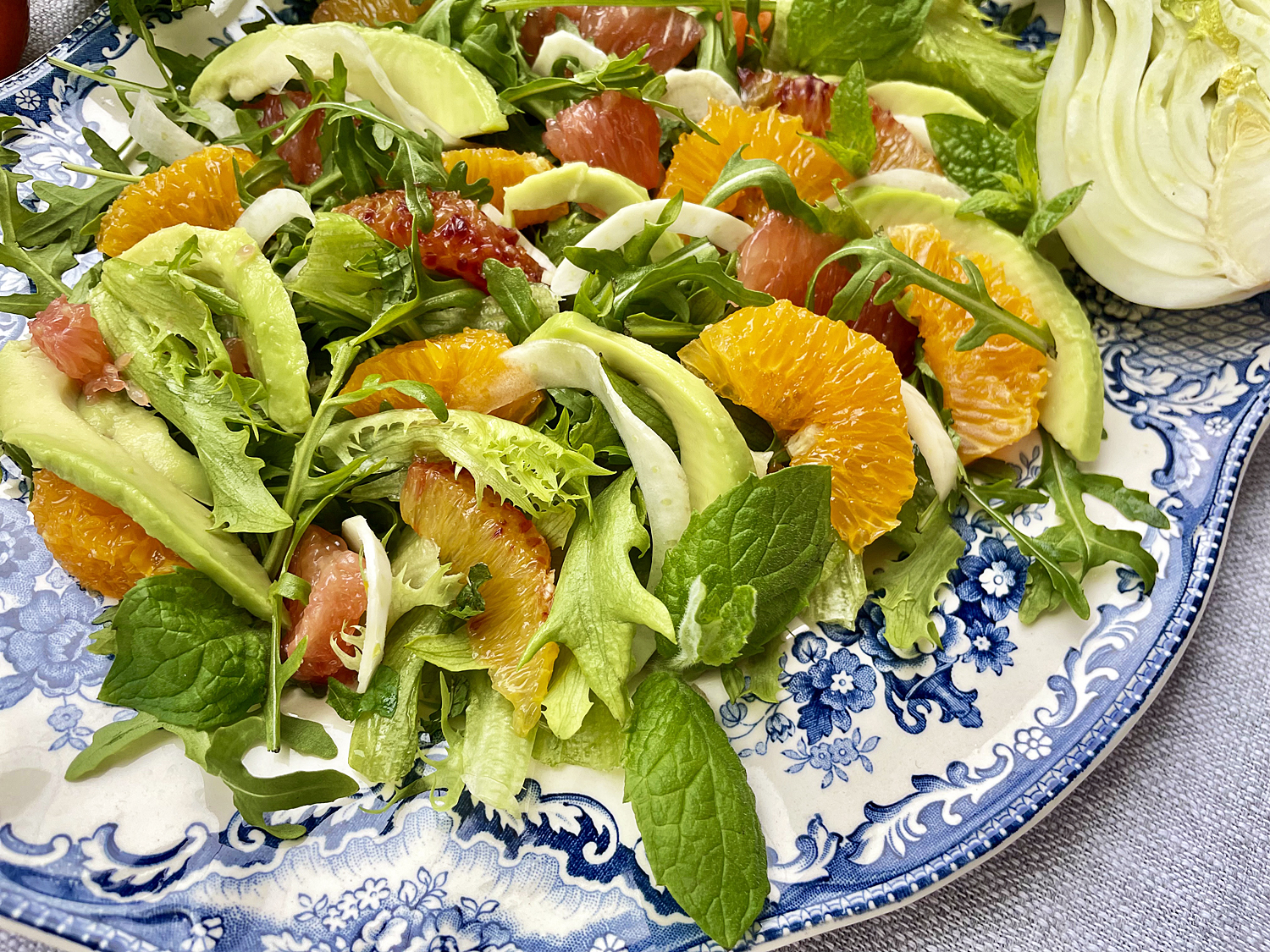 Tämän sitrussalaatin jujuna ovat erimakuiset sitrukset yhdistettynä kermaisen pehmeään avokadoon, rapsakkaan fenkoliin ja virkistävään minttuun. Tämä raikas salaatti sopii loistavasti jo värinsä puolesta pääsiäispöytään esimerkiksi alkupalaksi tai lisukkeeksi. Tällä kertaa salaatti ilahdutti lounassalaattina lämminsavulohen kanssa.
