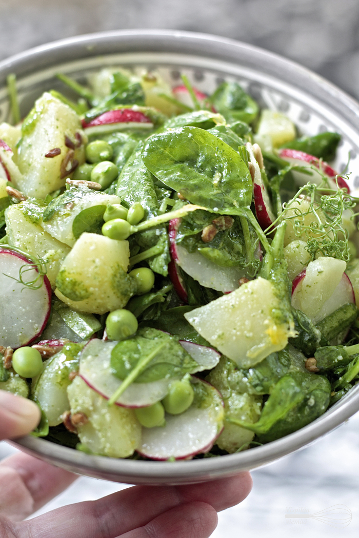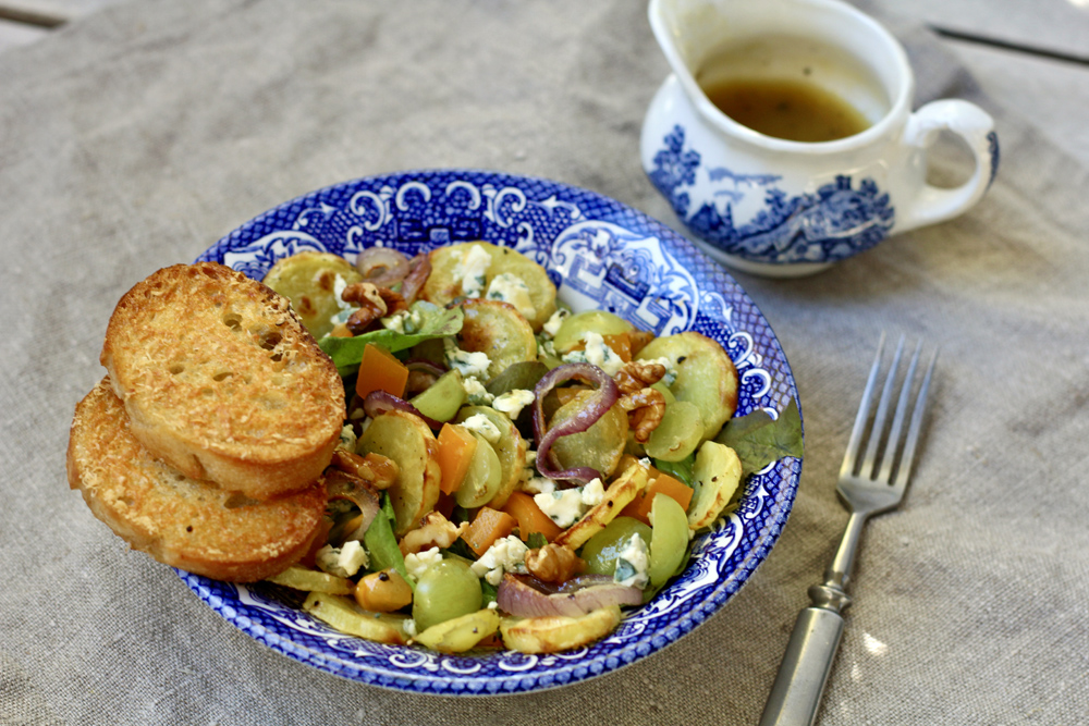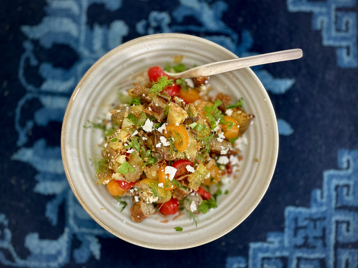 Suomalainen perunasalaatti elää sesongeissa. Perunasalaatit voivat kuitenkin olla paljon muutakin kuin vappu- ja uudenvuoden juhlapöydissä tarjottava majoneesinen lisuke. Perunasalaatti nimittäin kykenee muotoutumaan erilaisiin tilanteisiin nousten tarvittaessa aterian sivuroolista pääosaan. Tällä kertaa syntyi maukas perunasalaatti paahdetuista perunoista.